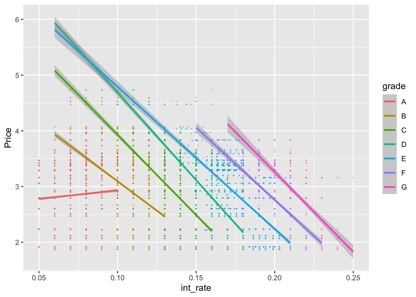 ## `gradeB:Price` -8.189e-03 2.423e-04 -33.794 < 2e-16 ***