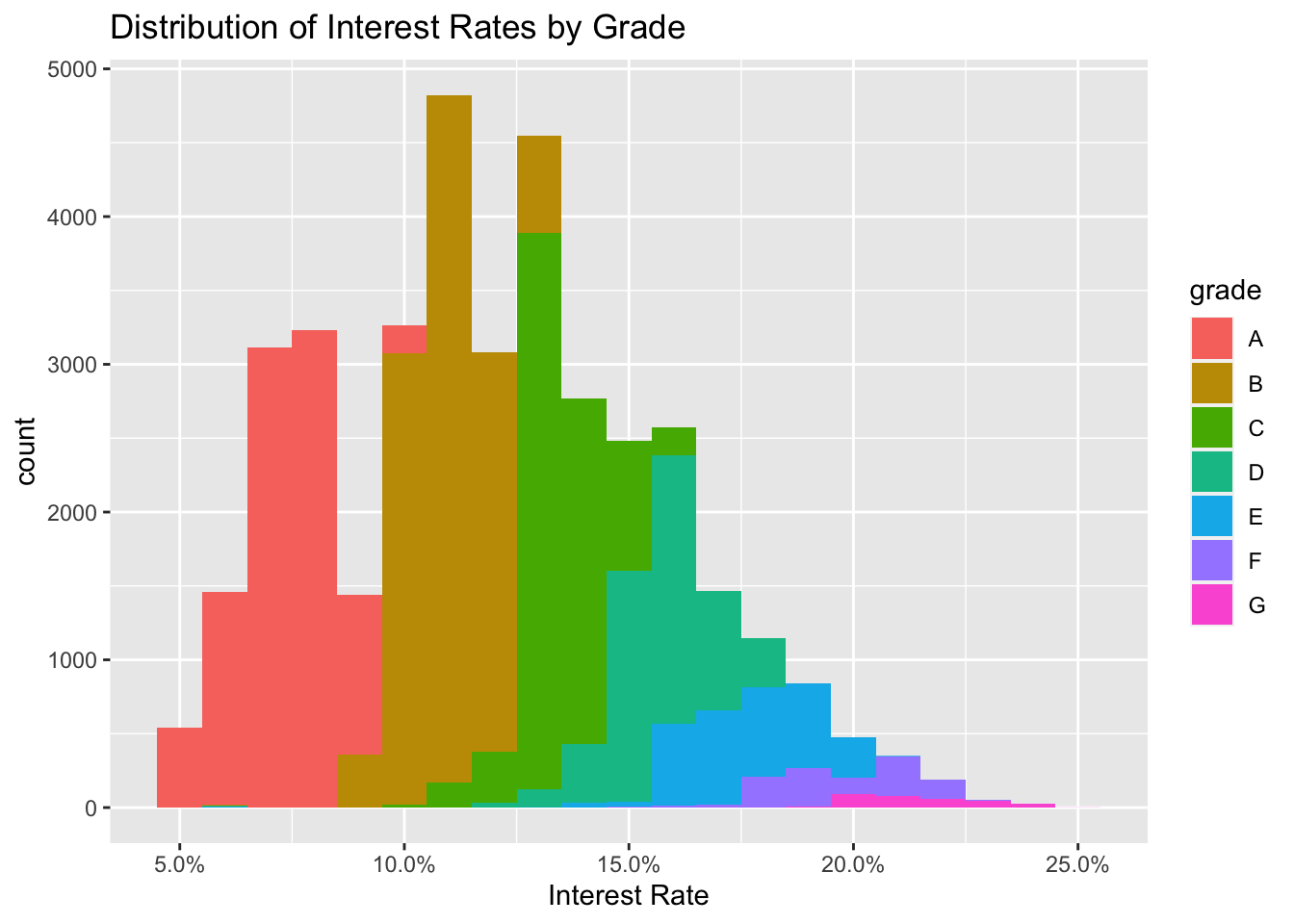 labs(x="Interest Rate", title = "Distribution of Interest Rates by Grade")