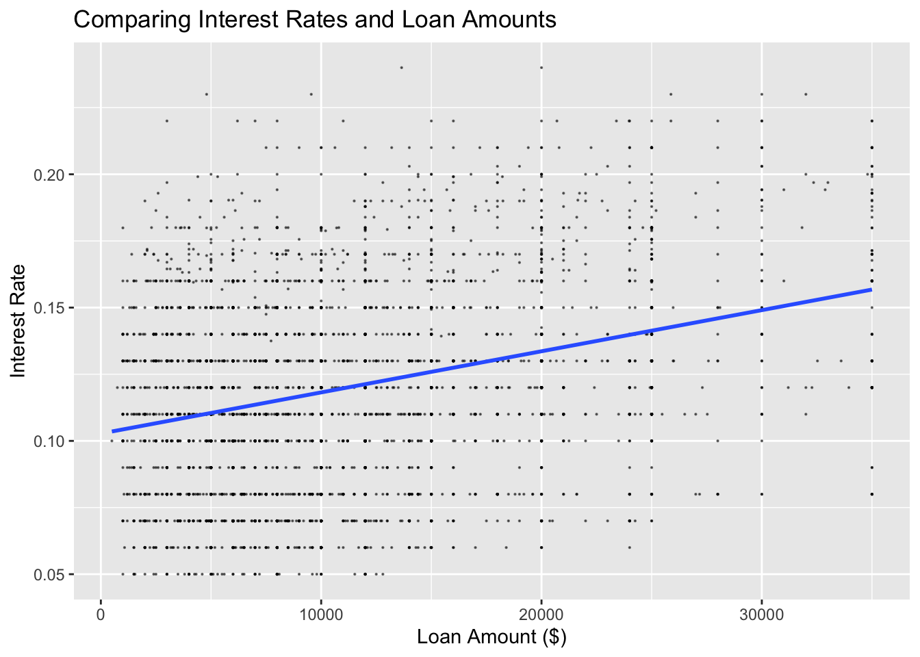 labs(y="Interest Rate", x="Loan Amount ($)", title = "Comparing Interest Rates and Loan Amounts")