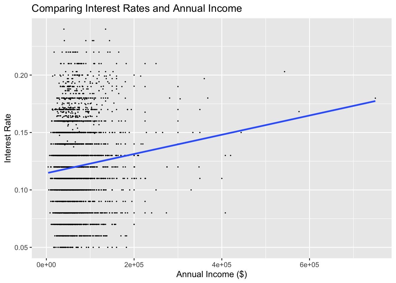 labs(y="Interest Rate", x="Annual Income ($)", title="Comparing Interest Rates and Annual Income")