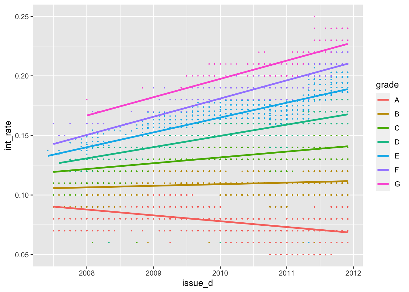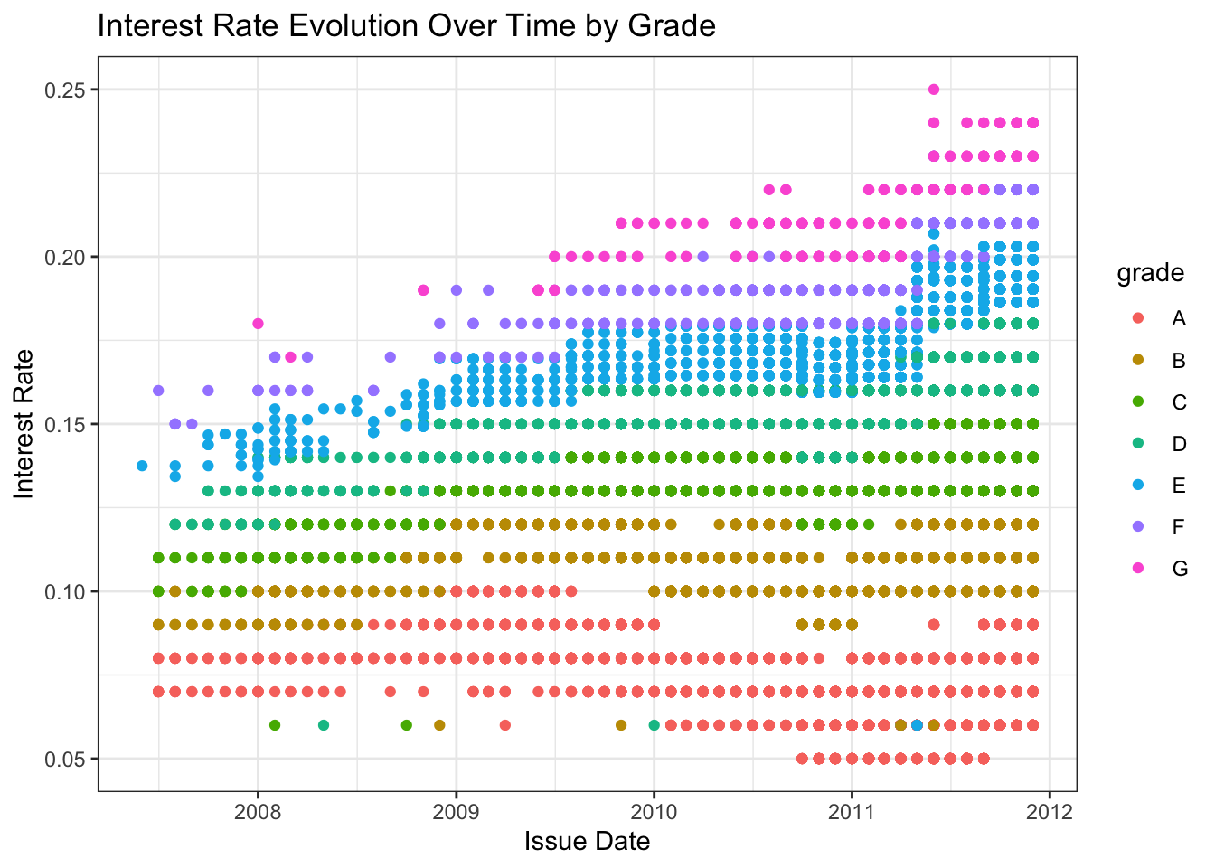 labs(title="Interest Rate Evolution Over Time by Grade", x="Issue Date", y="Interest Rate")