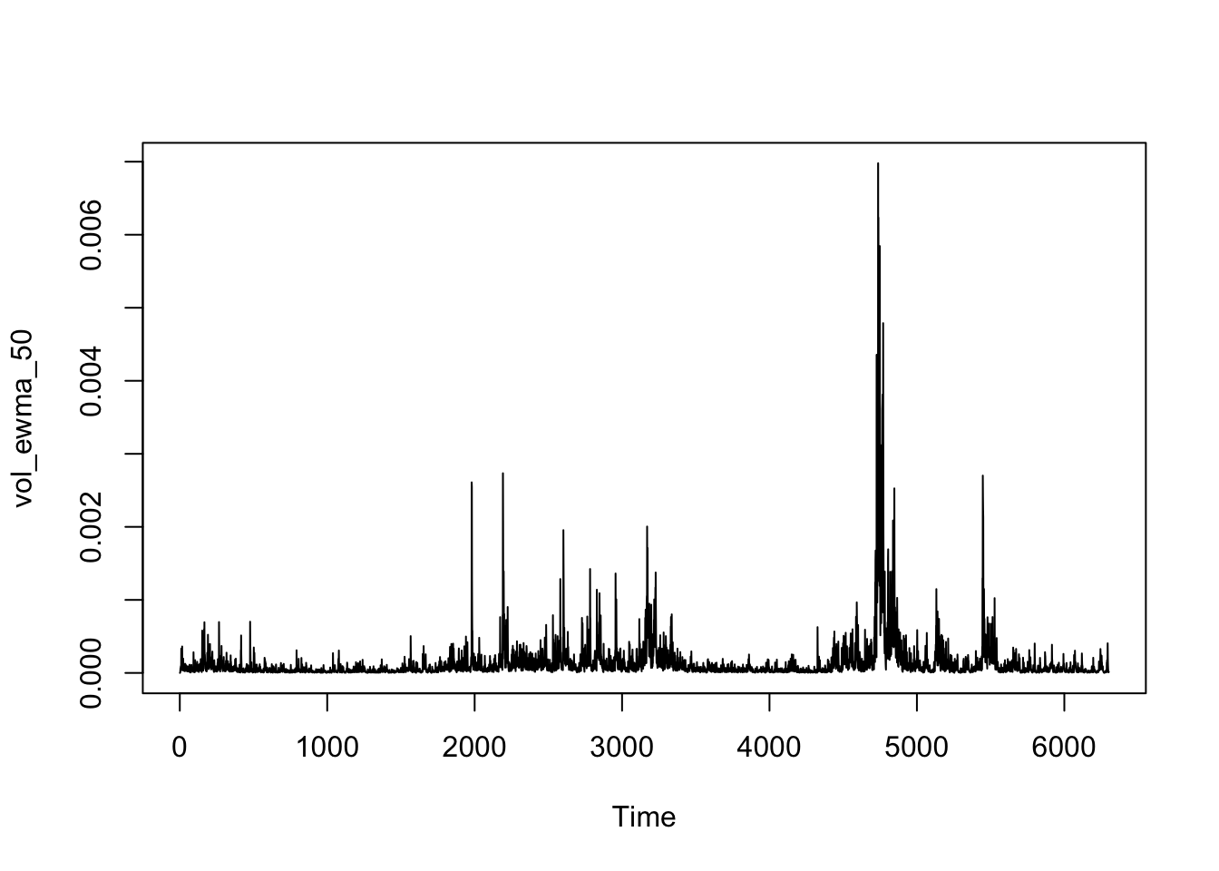 vol_ewma_50[i] = (1-lambda) * prices$SPINDX_log[i-1]^2 + lambda* vol_ewma_50[i-1]