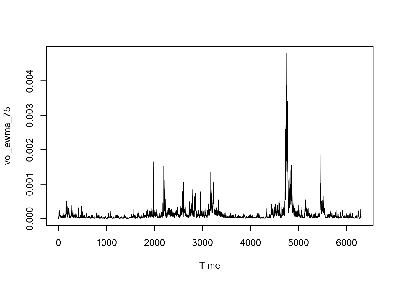 vol_ewma_75[i] = (1-lambda) * prices$SPINDX_log[i-1]^2 + lambda* vol_ewma_75[i-1]