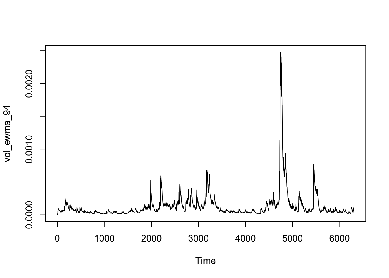 vol_ewma_94[i] = (1-lambda) * prices$SPINDX_log[i-1]^2 + lambda* vol_ewma_94[i-1]