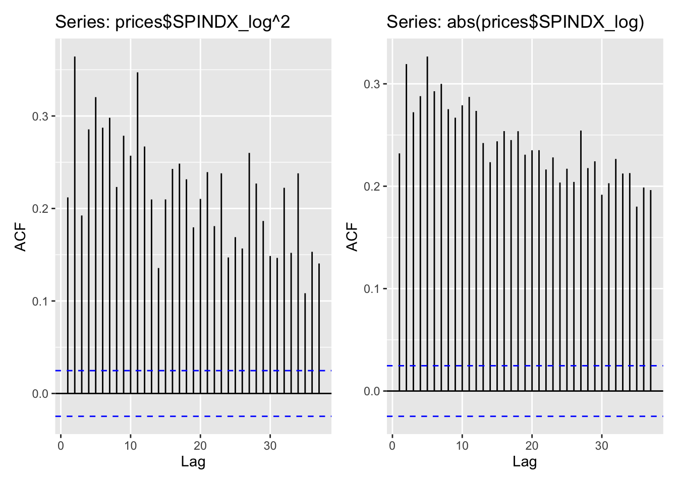 ggAcf(prices$SPINDX_log^2)+ggAcf(abs(prices$SPINDX_log))
