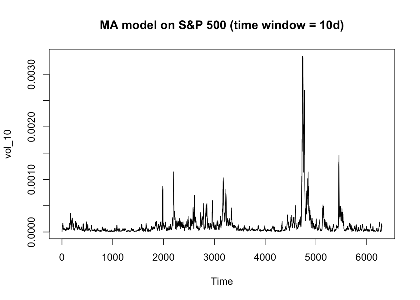 ts.plot(vol_10, main = "MA model on S&P 500 (time window = 10d)")